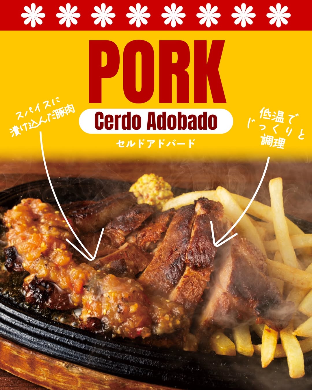 オリジナルのアドボソースに漬け込み、低温でじっくり火を入れた豚肉料理🇲🇽