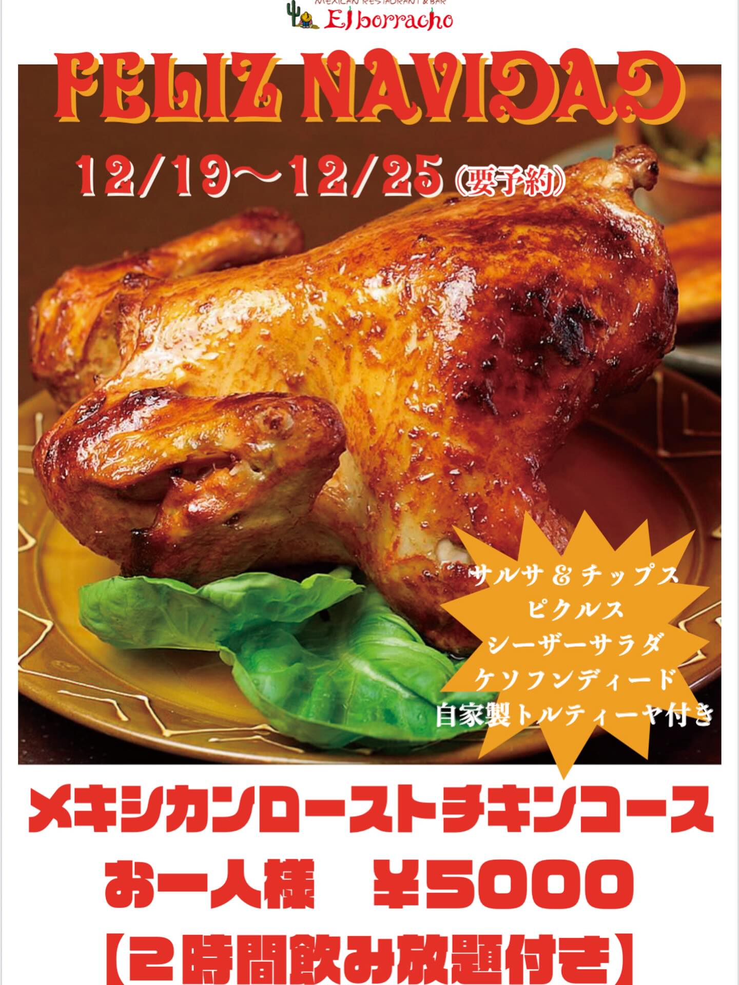 エルボラーチョ・カルボン 西新店 2025/12/03 12/19〜12/25【メキシカンローストチキンコース】 12/19〜12/25 【メキシカンローストチキンコース】 2時間飲み放題付きのコースです。 @fukuokacraft オリジナルクラフトビールも入ってます🍺 ご予約お待ちしております! 例年通り テイクアウトのご予約も受け付けております! « 前の記事