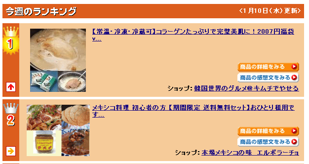 代表ブログ 2007/01/12 やった~~~~!! エルボラツウのみなさんなら、 もう、知っている人も多いと思うのですが、 実は、去年末から、楽天市場に出店しているんです..... エルボラーチョが、その楽天市場の多国籍料理部門の週間ランキングで、 な、な、な、な~~~~んと、 第二位に、入りました。 疑っているでしょ~~~~う?!?!?! 本当なんですから(^-^)/ こんな感じです。 みんなのお陰です ありがとうございま~~す(^ε^)♪ 今年は、楽天市場、制覇目指そうっと « 前の記事 次の記事 »